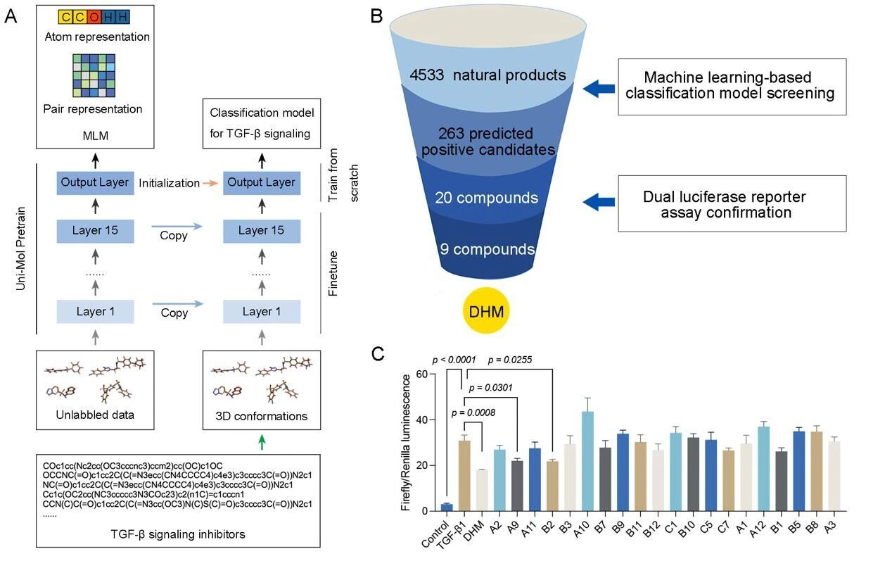新闻网讯  10月28日,中国工程院主办的中国科技期刊卓越行动计划领军期刊《Engineering》在线发表了日韩欧美福利视频_黑人巨大人精品欧美三区_欧美成人另类人妖_欧美在线精品一区二区三区_欧美一区二区三区性视频_日韩精品欧美视频_性欧美极品xxxx欧美一区二区药学院王昊教授团队与中国医学科学院医药生物技术研究所游雪甫、杨信怡研究员合作的最新研究成果。日韩欧美福利视频_黑人巨大人精品欧美三区_欧美成人另类人妖_欧美在线精品一区二区三区_欧美一区二区三区性视频_日韩精品欧美视频_性欧美极品xxxx欧美一区二区2022级博士研究生任一鑫(共同第一作者),基于迁移学习技术,自主构建了高效的TGF-β信号通路抑制剂筛选模型,实现从4533种天然产物到9个高活性化合物的精准筛选。该研究首次揭示了天然黄酮化合物二氢杨梅素通过抑制TGF-β/ALK5信号级联发挥作用的机制,为肺纤维化这一临床难治性疾病的治疗开辟了新型路径。
