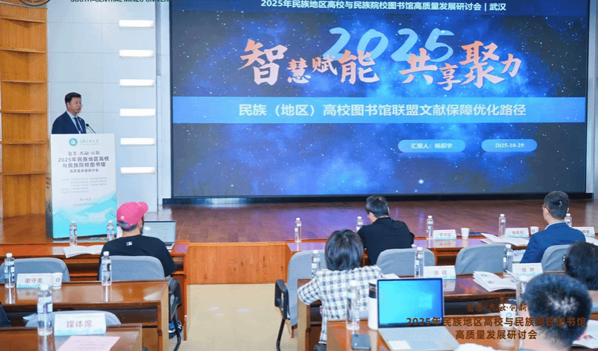 在专家报告环节,武汉大学人文社会科学资深教授陈传夫,武汉大学图书馆副馆长黄如花等专家就新时代的图书馆发展问题进行了阐述。我校图书馆副馆长杨蔚宇受邀作题为《智慧赋能共享聚力:民族(地区)高校图书馆联盟文献保障优化路径》的主旨报告,分析了加强民族(地区)高校图书馆联盟的重要性、基本思路和技术路径。